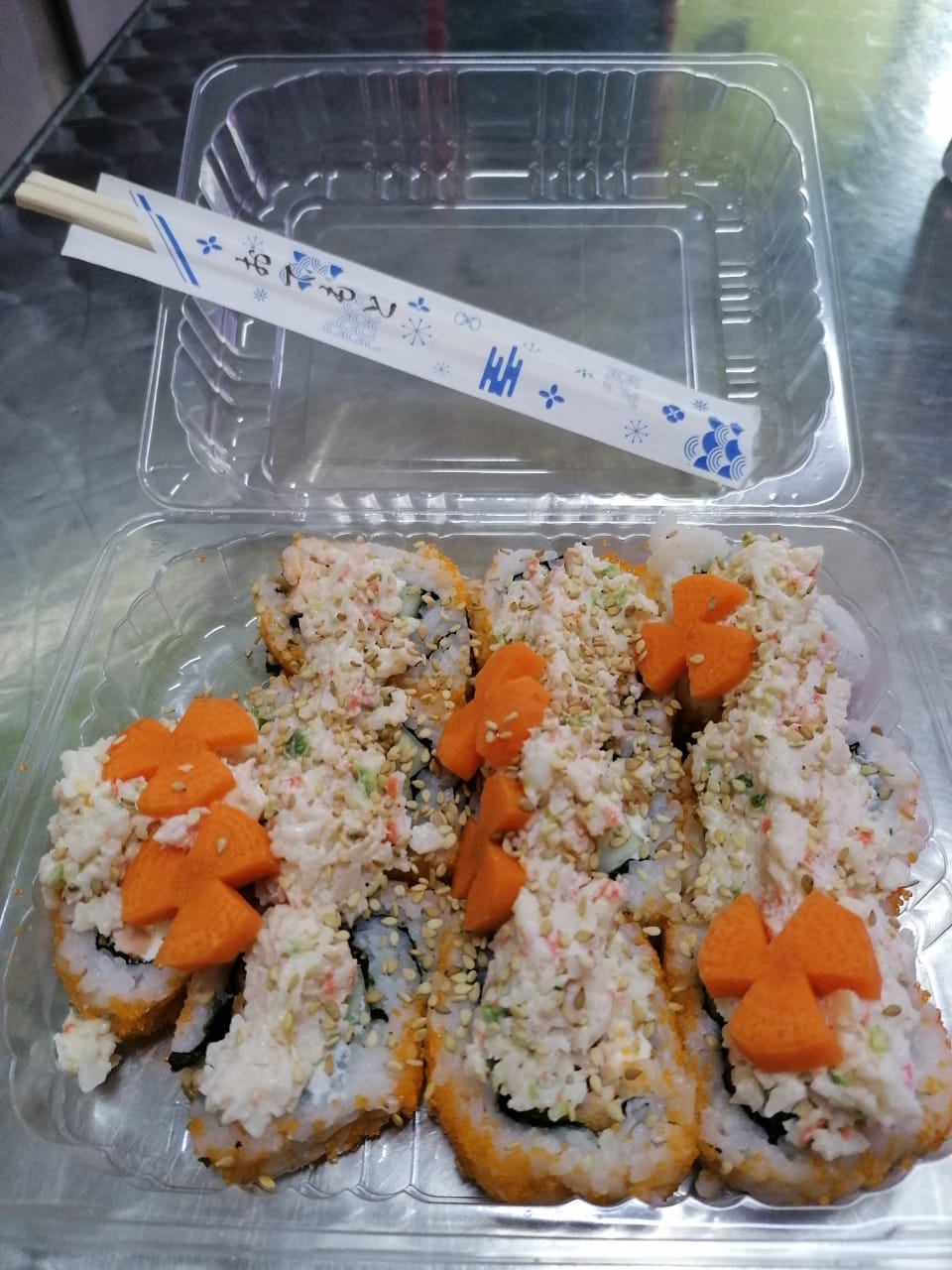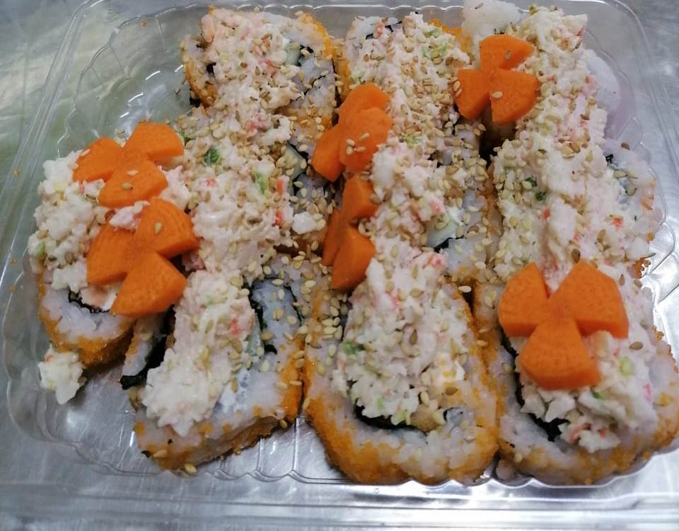 | POR FUERA CAPEADO Y MASAGO, ADENTRO AGUACATE, PEPINO, SALMÓN Y CAMARÓN, ENCIMA PASTA DE CANGREJO Y MASAGO | ||